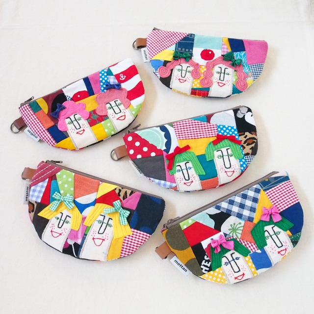 【sold out】【セット販売 】 カオ刺繡の丸っとポーチ37-38 お顔刺繡の半月ポーチ 24