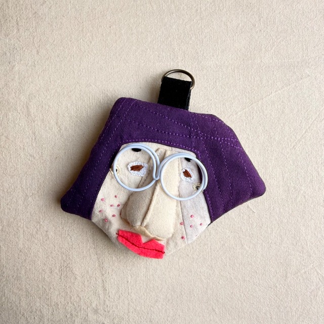 【委託販売先→岡山県真備町ポプリ】 ファスナータイプ メガネはピンバッヂ ボールチェーン付き。 本体サイズ タテ 14cm × ヨコ 14cm マチ 無し