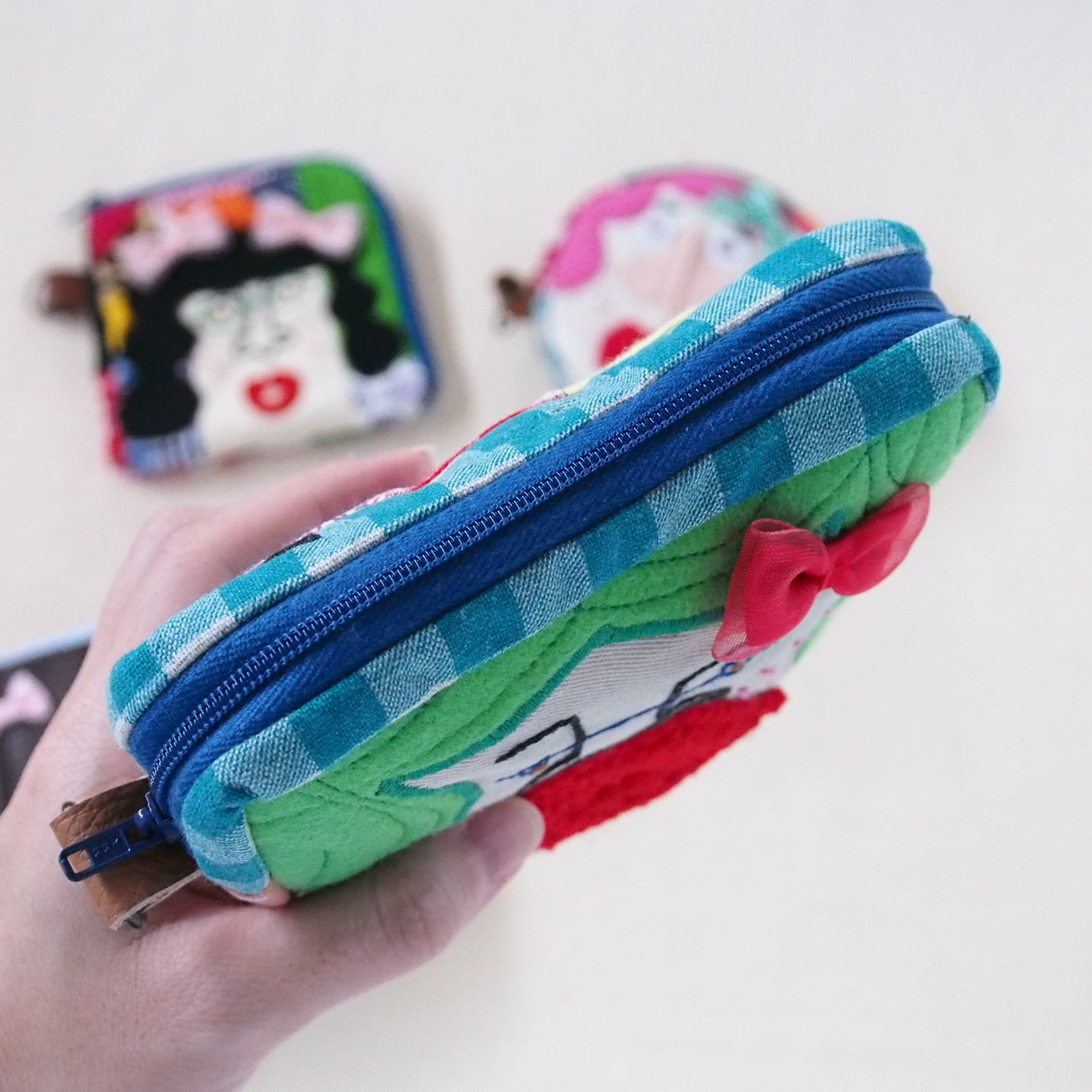顔刺繍デザインが魅力的な丸っとポーチ。