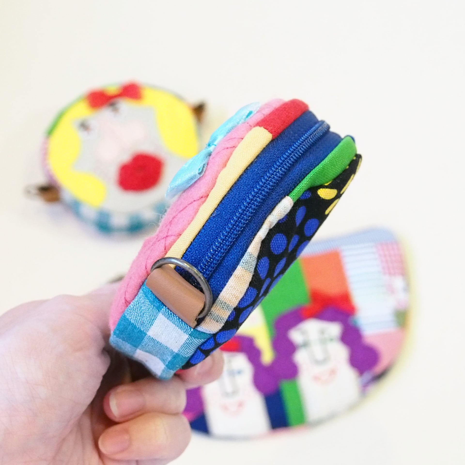 顔刺繍デザインが魅力的な丸っとポーチ。