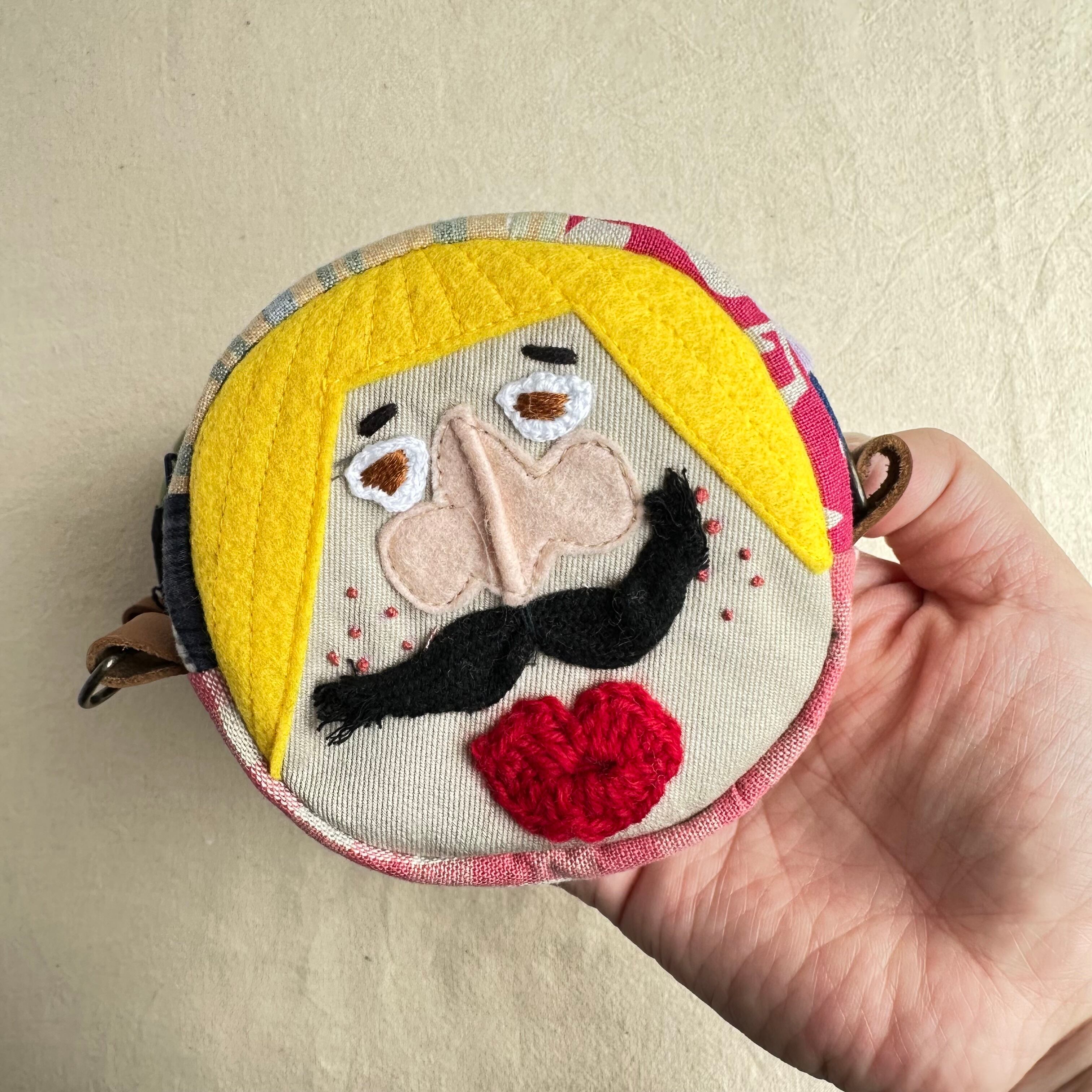 顔刺繍デザインが魅力的な丸っとポーチ。