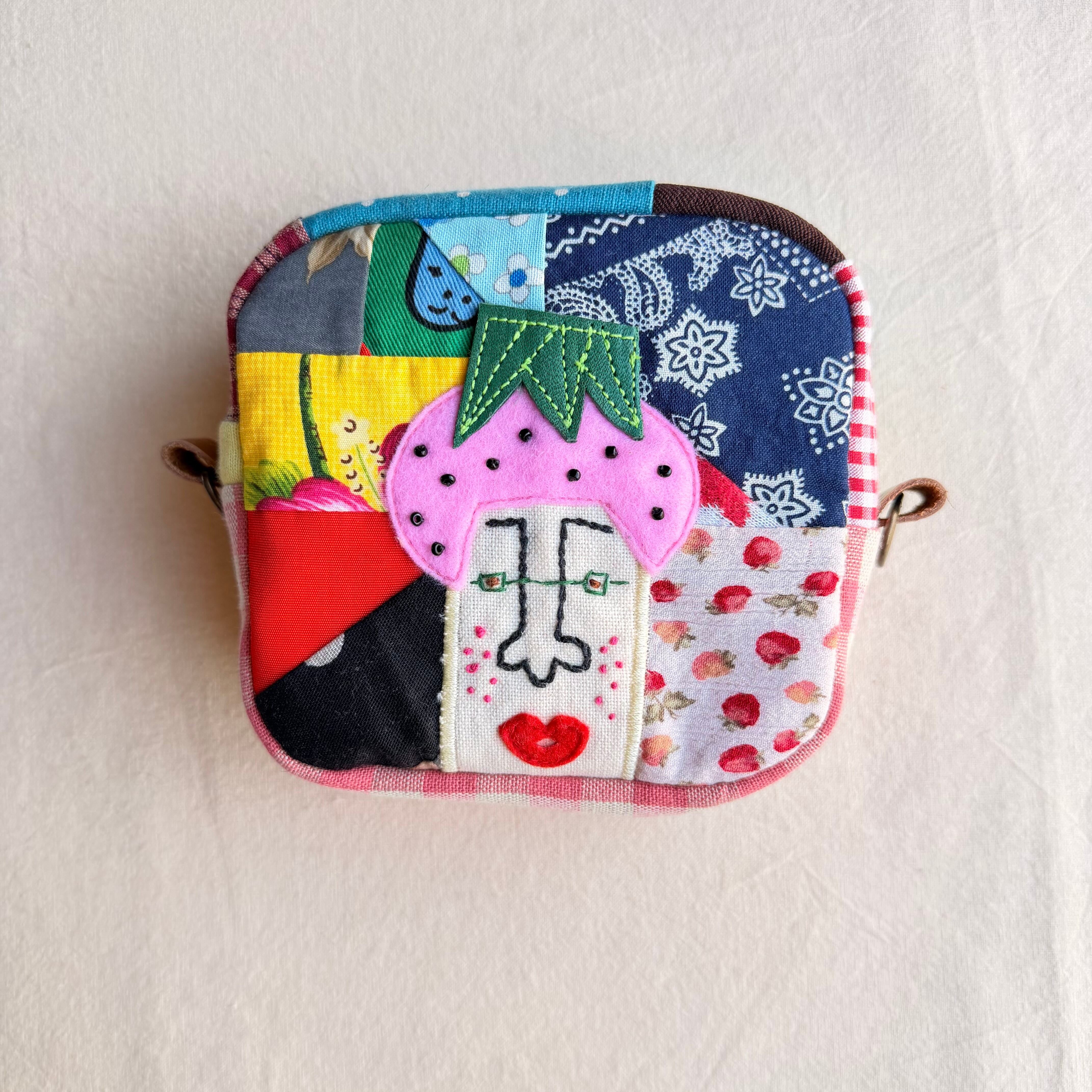 カオ刺繍の角丸ポーチ