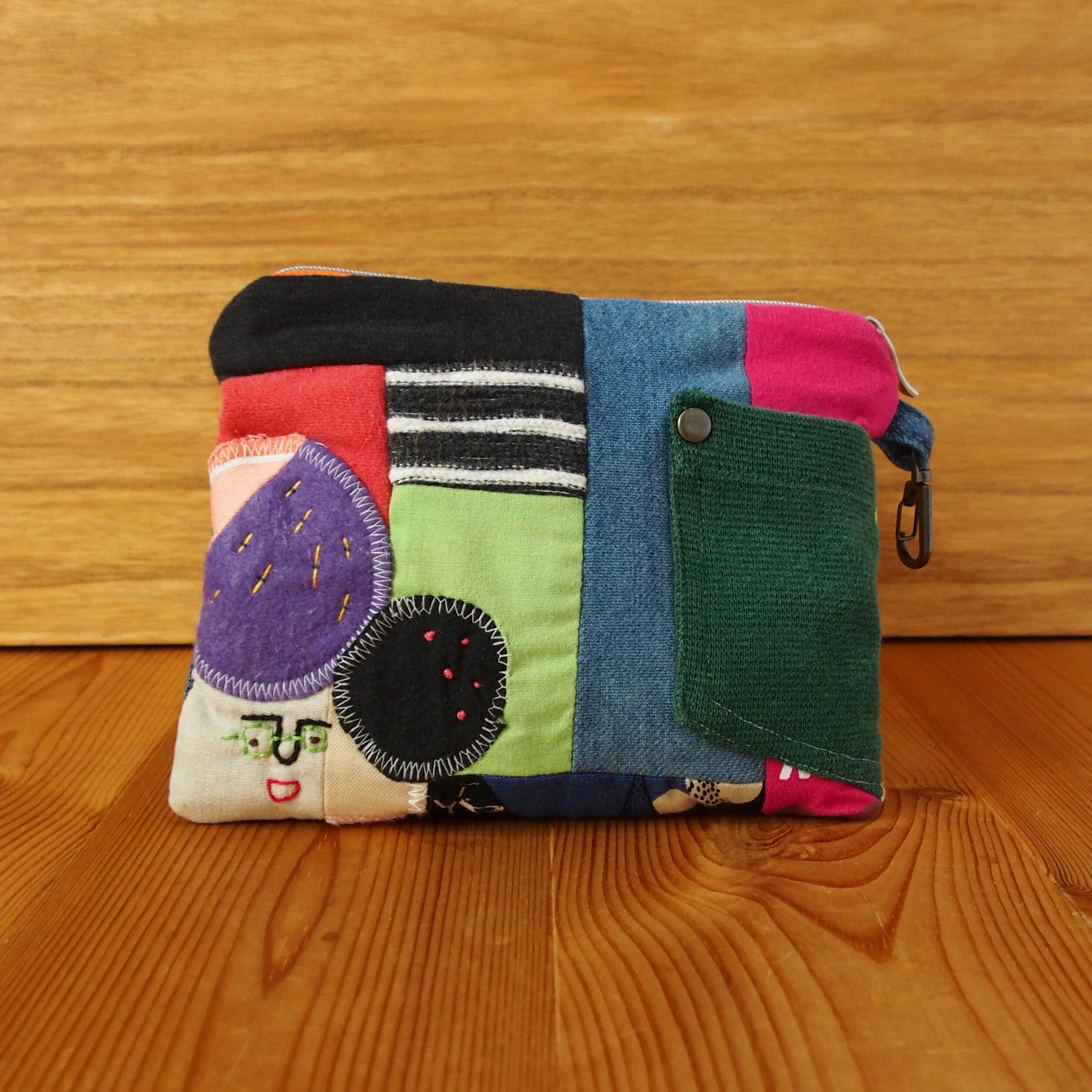 カオ刺繍のぺたんこポーチ II