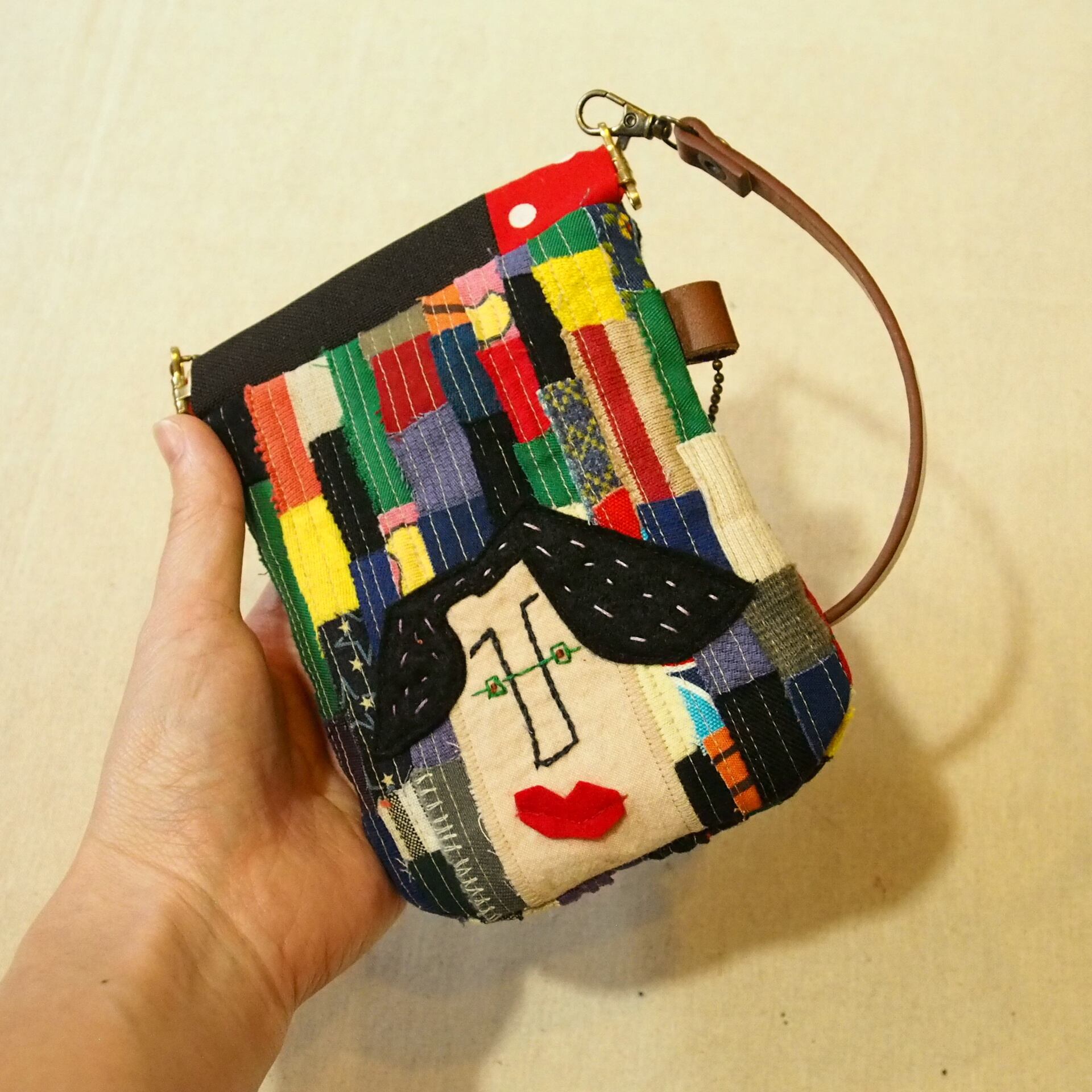 カオ刺繍のミニバッグ風ぺたんこバネポーチ