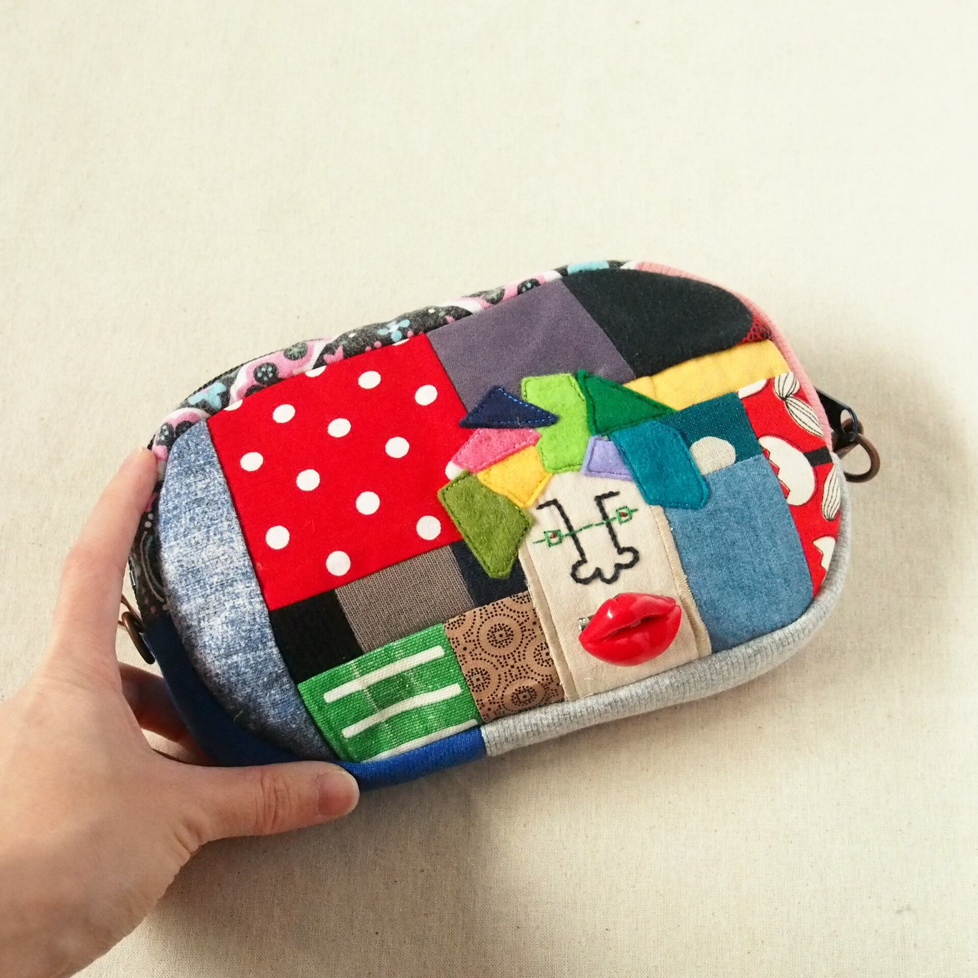 お顔刺繍のショルダーBag、ポーチ